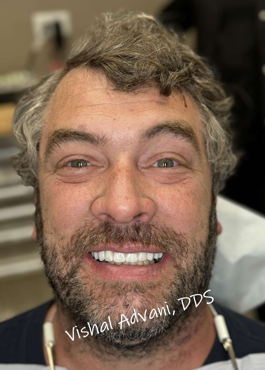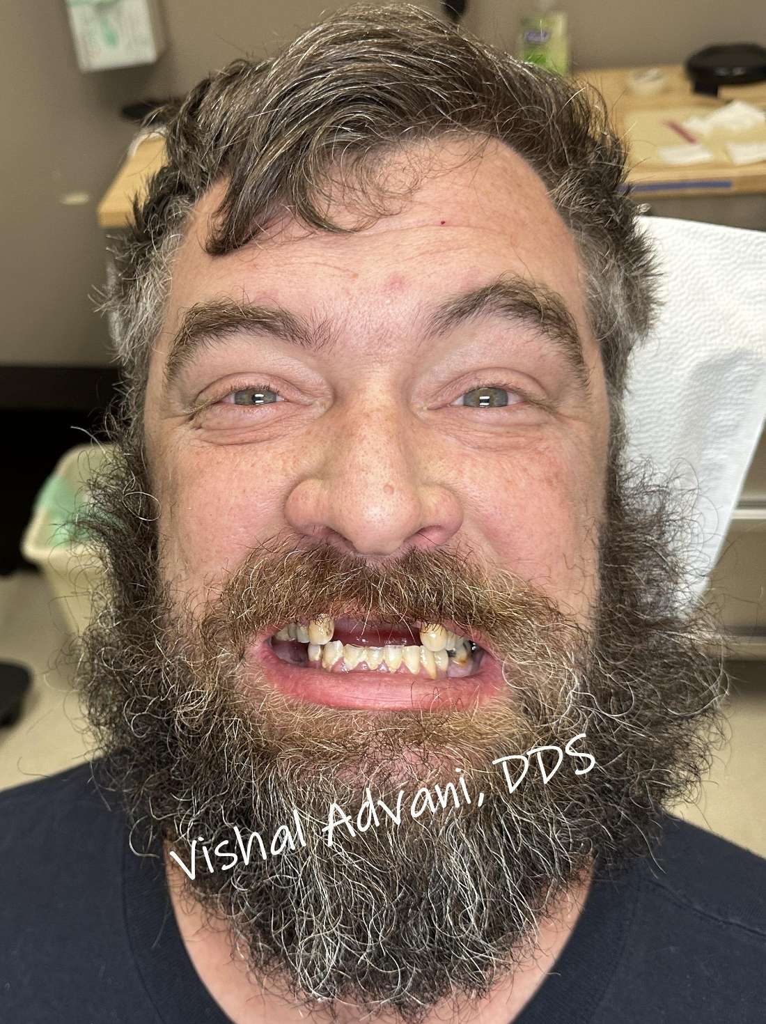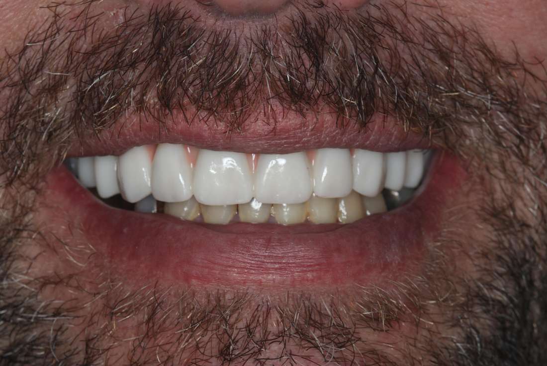 Dr. Vishal Advani removed the remaining top teeth and 4 dental implants were placed by him simultaneously. A temporary bridge was screwed in place while the implants healed.