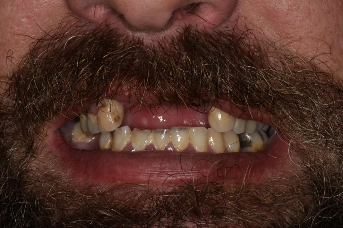 Years of smoking and avoiding the dentist took a toll on this patient's teeth. Multiple teeth were decaying and breaking. The patient had painful teeth removed and was looking for a solution to help with eating.