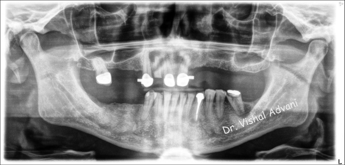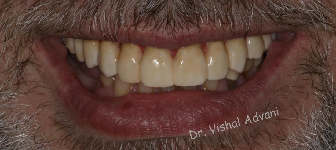 The broken and infected front teeth were removed and 5 implants were placed by Dr. Vishal Advani. The patient left with a screwed-down, attached bridge. The entire procedure was completed in less than 3 years, which included removing the broken teeth, the placement of 5 dental implants and attached a temporary bridge. All the steps were completed by Dr. Vishal Advani in one location.