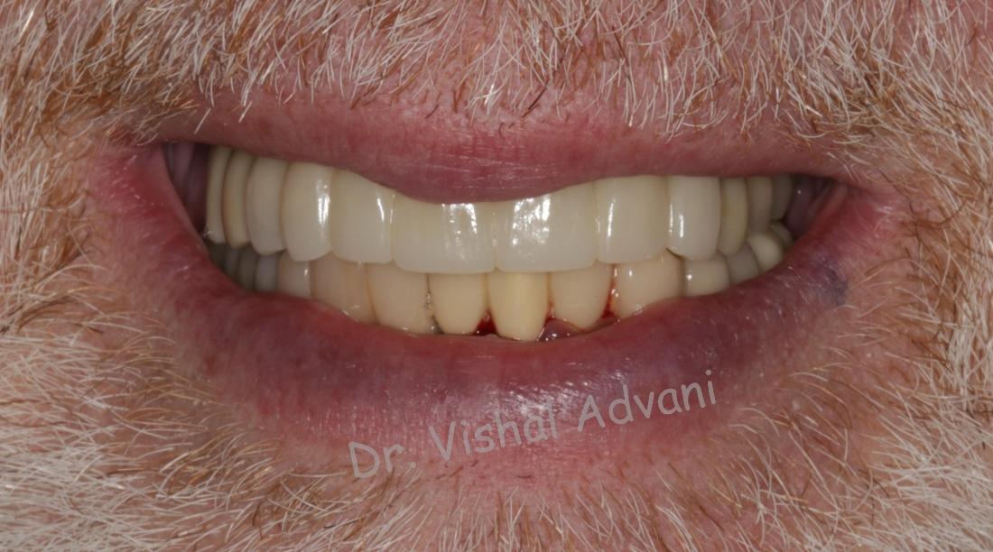 Dr. Vishal Advani removed the front broken teeth and placed 4 dental implants, as well as bone grafting. A permanent bridge was placed by Dr. Advani to give our patient an amazing smile.