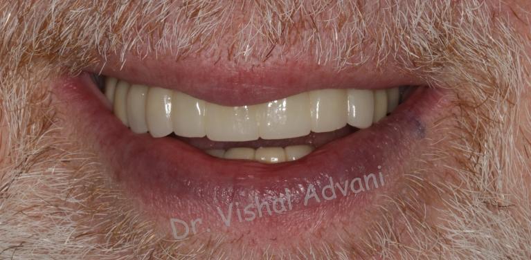 Life changing procedure for our wonderful patient. His teeth were loose and infected and could not be saved. Dr. Vishal Advani placed upper and lower implants after removing the teeth. Temporary bridges were placed immediately, all in one day. After full healing, the permanent zirconia bridges were placed by Dr. Advani. The patient could not have been happier