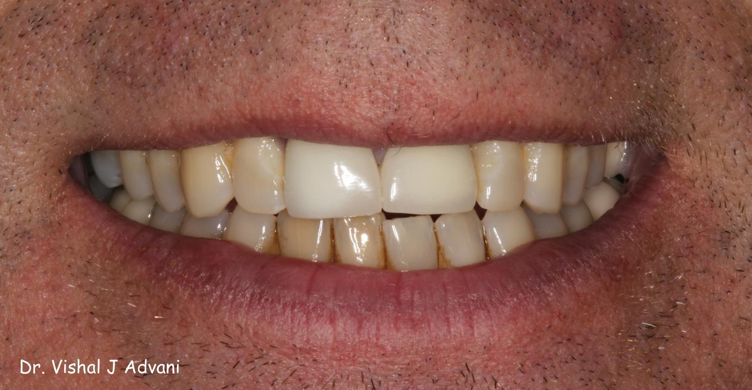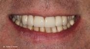 This patient was unhappy with his front two crowns, that were done by another dentist over 10 years ago. He didn't like the color or size of his crowns. He also was unhappy with the metal showing underneath his crowns. The old crowns were replaced by Dr. Advani with natural looking, all-ceramic crowns, with no metal underneath. Veneers were placed on the other front teeth to give a natural blend to the teeth and to improve the smile. The patient was thrilled with the end result!