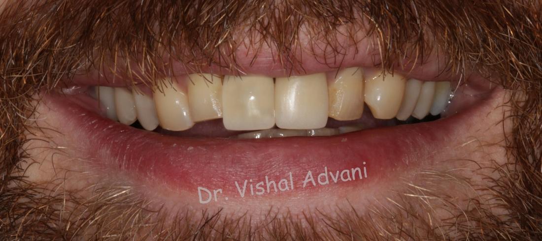 Our patient had an old root canal with post and crown that fractured at the gum level. This is a very common issue for an old root canal and crown in the front. Dr. Vishal Advani removed the broken piece of the tooth, placed a dental implant the same day and a temporary crown was placed the same day. After 3 months of healing, the permanent crown was placed and our patient couldn't be happier.