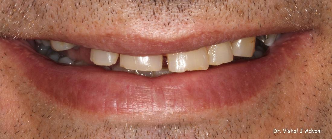This patient had a large cavity on his front tooth and the tooth couldn't be saved due to the size of the cavity. The tooth was extracted by Dr. Advani and a bone graft was placed to preserve the site. After 2 months, a dental implant was placed by Dr. Advani and the final crown was placed after full healing was complete. The patient plans to replace his other missing teeth with implants in the future.