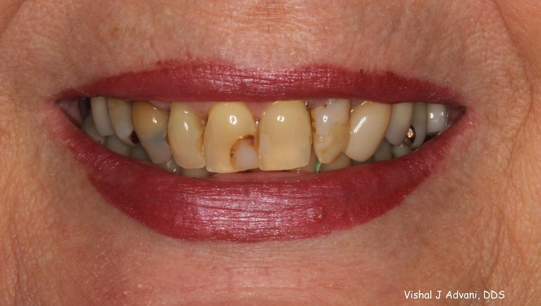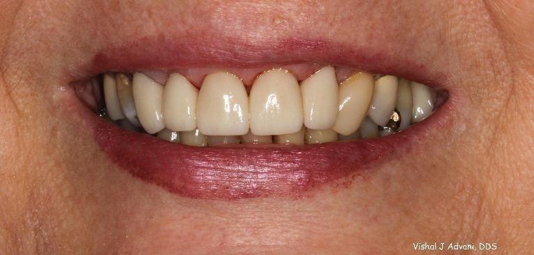 This patient was unhappy with her old fillings on her front teeth that had staining and cavities starting. She also was unhappy with the color of her front teeth. New crowns were done on her front teeth to improve her overall smile. The patient was beyond happy with the change in her look! Her sensitivity in the front also disappeared after placement of the crowns
